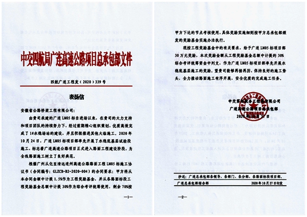 近日,中交四航局廣連高速公路項目總承包部發(fā)來表揚信,對公司承建的廣連高速05標優(yōu)質(zhì)高效完成1#水穩(wěn)場站建設和率先啟動水穩(wěn)底基層試驗段施工給予表彰。