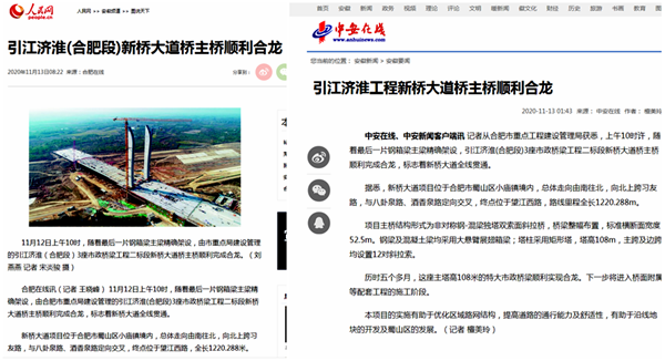 11月12日上午10時,隨著最后一片鋼箱梁主梁精確架設,公司承建的引江濟淮(合肥段)3座市政橋梁工程二標段新橋大道橋主橋順利完成合龍,全線實現(xiàn)貫通,人民網、中安在線、安徽電視臺、合肥電視臺等多家主流媒體聚焦報道。
