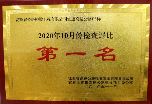 近日,江西省高速集團宜遂項目辦下發(fā)關(guān)于表彰十月份檢查評比先進單位的通報文件,公司承建的宜遂高速P3標(biāo)在綜合檢查評比中表現(xiàn)優(yōu)秀,榮獲路面單位第一名。