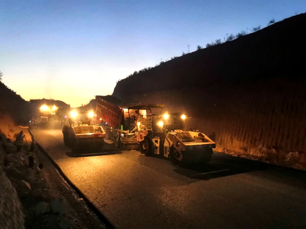 項目全長34.6公里,途徑四個鄉(xiāng)鎮(zhèn),在完成路基施工后,根據(jù)交驗時間分段進入路面攤鋪。立足實際情況,項目充分發(fā)揮主觀能動性,尋找一切可利用的工作面,精心策劃、見縫插針組織路面施工。在率先完成一工區(qū)水穩(wěn)、瀝青攤鋪施工任務(wù)后,迅速組織精干力量,轉(zhuǎn)戰(zhàn)一二工區(qū)連接部分攤鋪施工,僅用20余天打通了兩個工區(qū)的運輸通道。