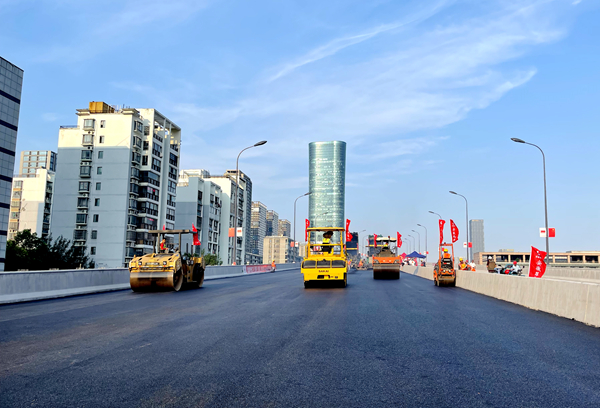 暢通二環(huán)(西南環(huán))金寨路、合作化路節(jié)點(diǎn)工程主線高架橋橋面首次瀝青攤鋪?lái)樌瓿?/h2>