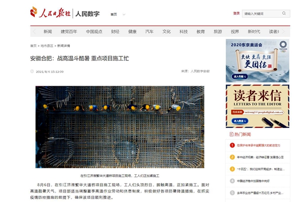 8月6日,《人民日?qǐng)?bào)》數(shù)字安徽以《安徽合肥:戰(zhàn)高溫斗酷暑 重點(diǎn)項(xiàng)目施工忙》為題報(bào)道了公司承建的引江濟(jì)淮繁華大道橋項(xiàng)目建設(shè)情況。