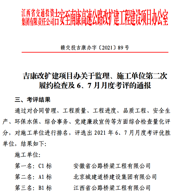 8月8日,吉康改擴建項目辦公布了2021年6、7 月考評結(jié)果,公司承建的吉康改擴建C1標連續(xù)兩個月獲月度綜合考核第一名。