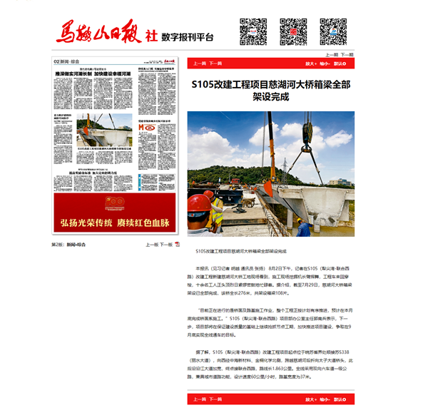 近日,公司承建的馬鞍山市S105改建工程項(xiàng)目慈湖河大橋箱梁全部架設(shè)完成,得到了馬鞍山電視臺、馬鞍山日報(bào)等當(dāng)?shù)刂髁髅襟w的重點(diǎn)關(guān)注。