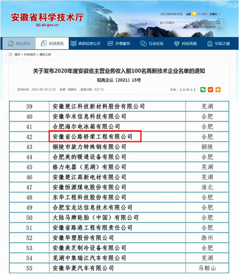 近日,安徽省科技廳發(fā)布2020年度安徽省主營(yíng)業(yè)務(wù)收入前100名高新技術(shù)企業(yè)名單,公司再次榮登百?gòu)?qiáng)榜單,位列第42位。