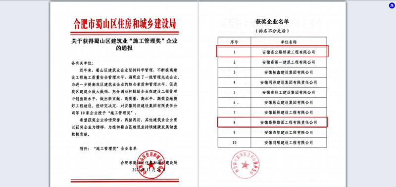 日前,公司榮獲蜀山區(qū)建筑業(yè)“經(jīng)濟(jì)貢獻(xiàn)獎(jiǎng)”、“高質(zhì)量發(fā)展獎(jiǎng)”、“高成長(zhǎng)企業(yè)獎(jiǎng)”、“施工管理獎(jiǎng)”四項(xiàng)表彰,是此次蜀山區(qū)建筑業(yè)企業(yè)評(píng)選中獲獎(jiǎng)最多的企業(yè)。公司全資子公司路面公司榮獲“高質(zhì)量發(fā)展獎(jiǎng)”(中小企業(yè))、“施工管理獎(jiǎng)”兩項(xiàng)表彰。