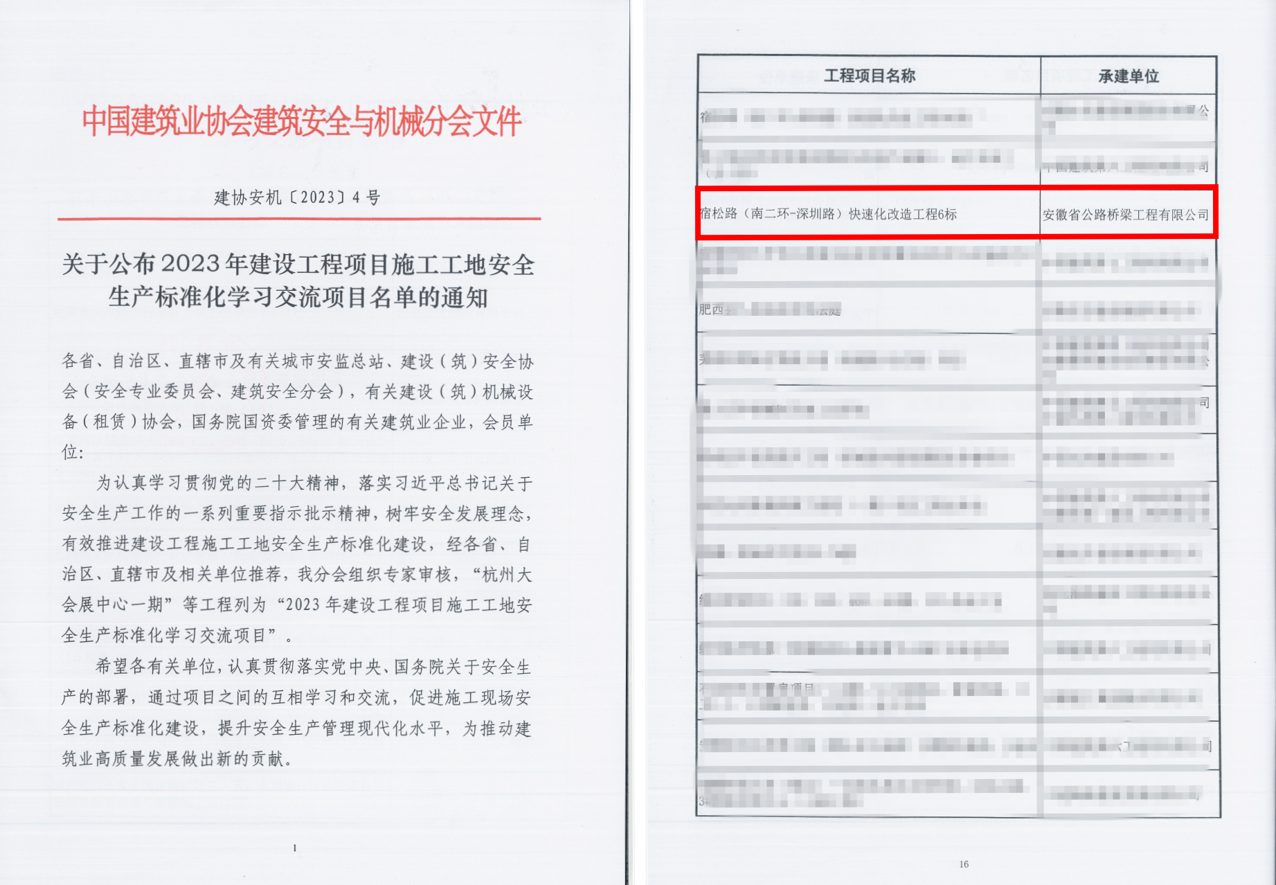近日,中國建筑業(yè)協(xié)會(huì)公布2023年建設(shè)工程項(xiàng)目施工工地安全生產(chǎn)標(biāo)準(zhǔn)化學(xué)習(xí)交流項(xiàng)目(原全國AAA安全文明標(biāo)準(zhǔn)化工地)名單,公司承建的宿松路(南二環(huán)-深圳路)快速化改造工程6標(biāo)段榜上有名。