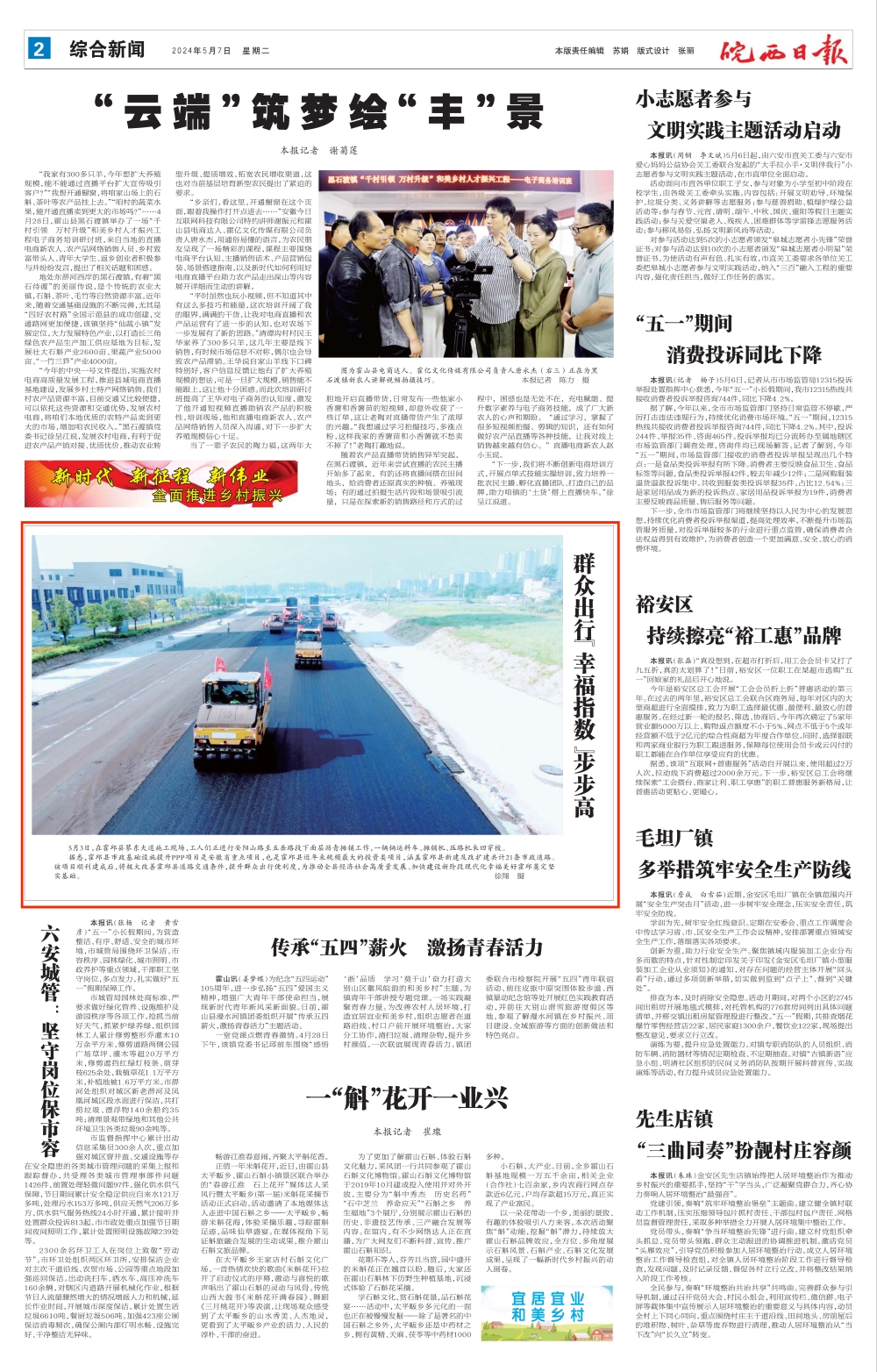 5月3日,在霍邱縣蓼東大道施工現(xiàn)場,工人們正進(jìn)行安陽山路至五岳路段下面層瀝青攤鋪工作,一輛輛運(yùn)料車、攤鋪機(jī)、壓路機(jī)來回穿梭。