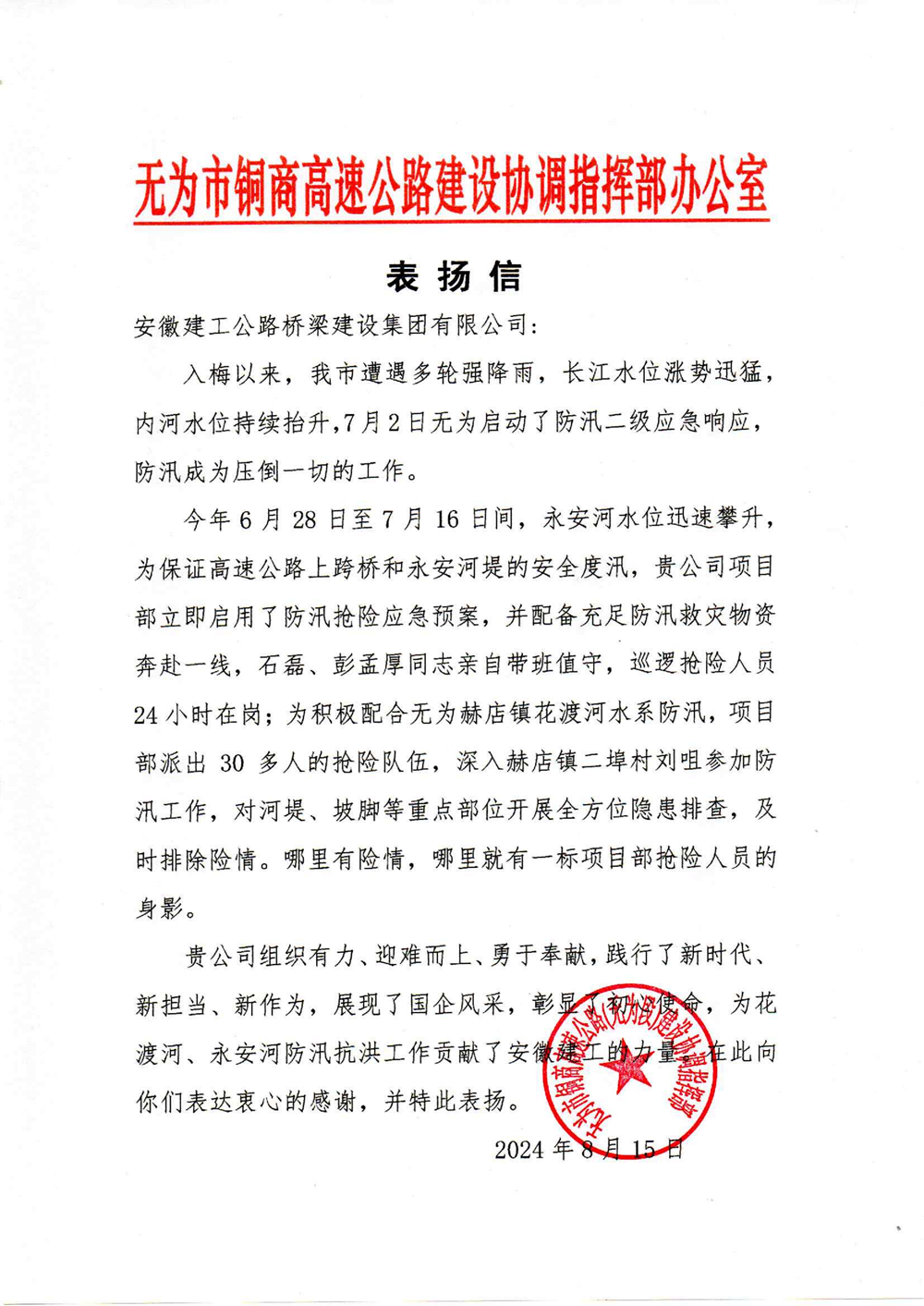 無為市銅商高速公路(無為段)建設協(xié)調(diào)指揮部對公司承建的銅商高速主體1標項目部進行表揚。來信指出,汛期期間,項目部及時啟動防汛搶險應急預案,配足物資奔赴一線,迎難而上,安排人員24小時巡邏,開展全方位隱患排查,為防汛抗洪工作作出了突出貢獻,展現(xiàn)了國企擔當。