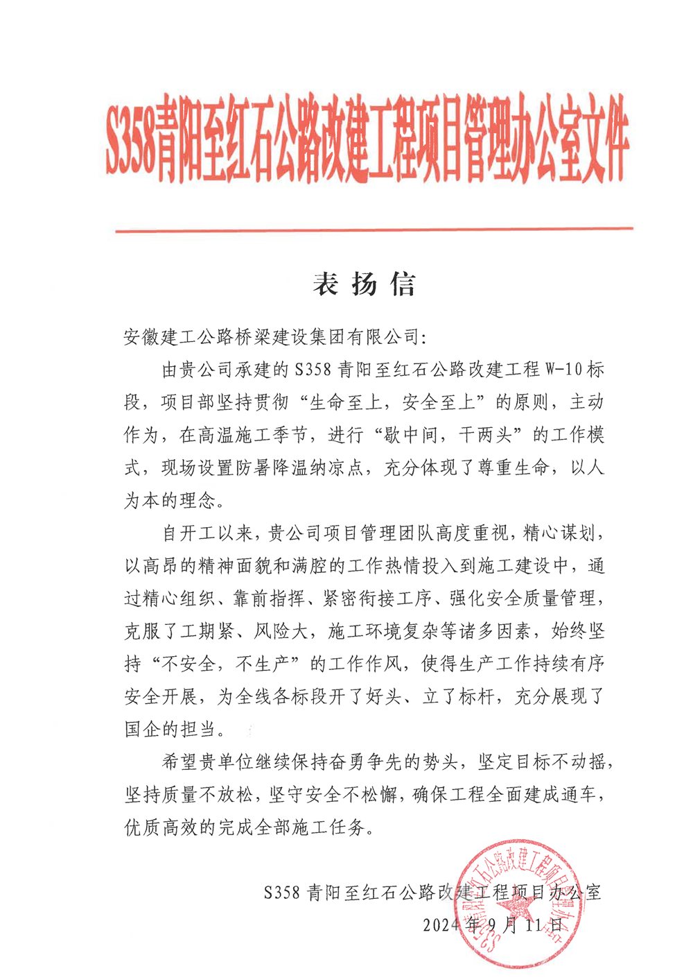 S358青陽至紅石公路改建工程項目辦公室來信指出,公司承建的W10標在高溫施工季節(jié),堅持貫徹“生命至上,安全至上”的原則、“不安全,不生產(chǎn)”的工作作風,落實防暑降溫措施和安全生產(chǎn)各項要求,體現(xiàn)了“以人為本”的理念。