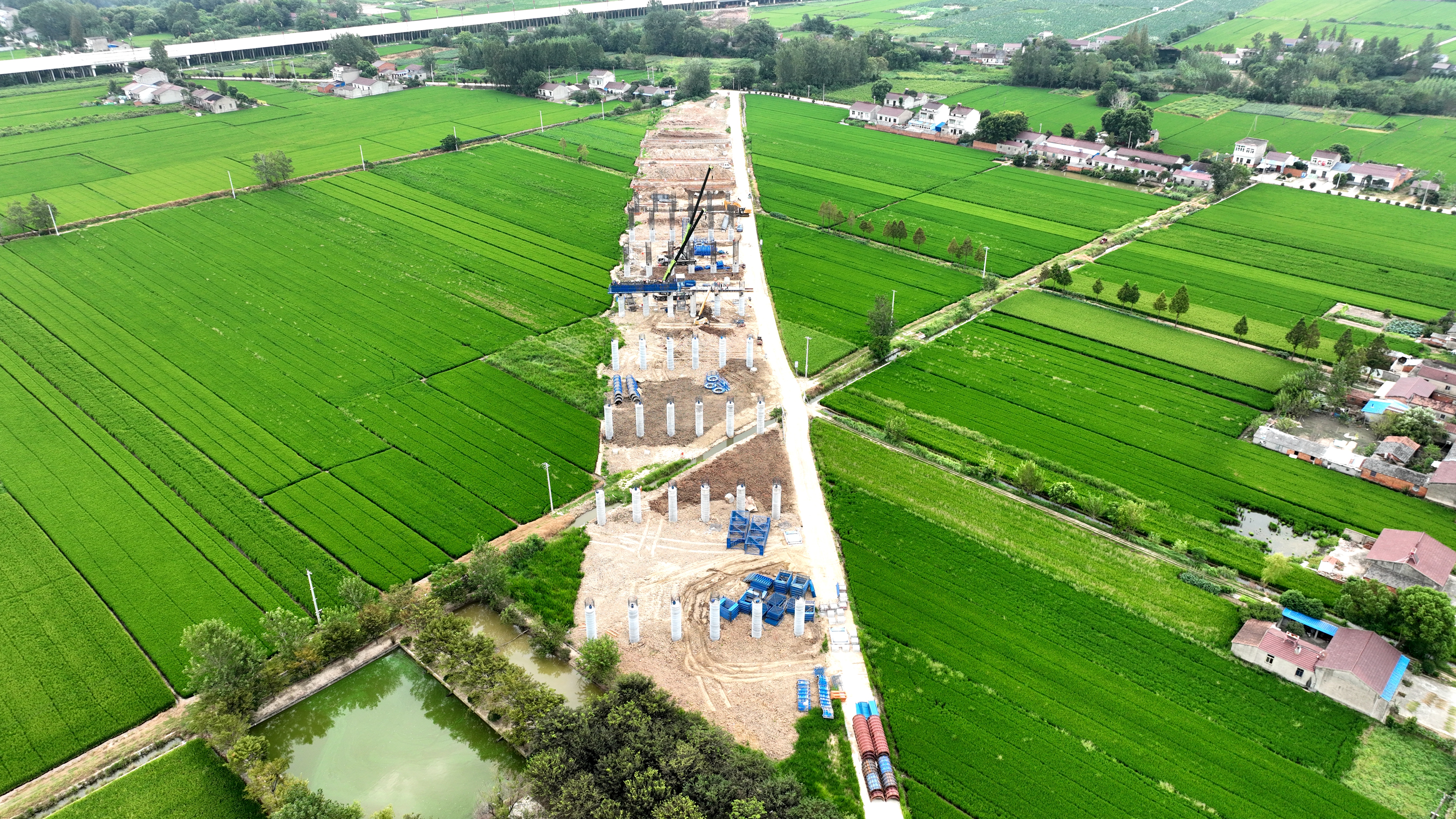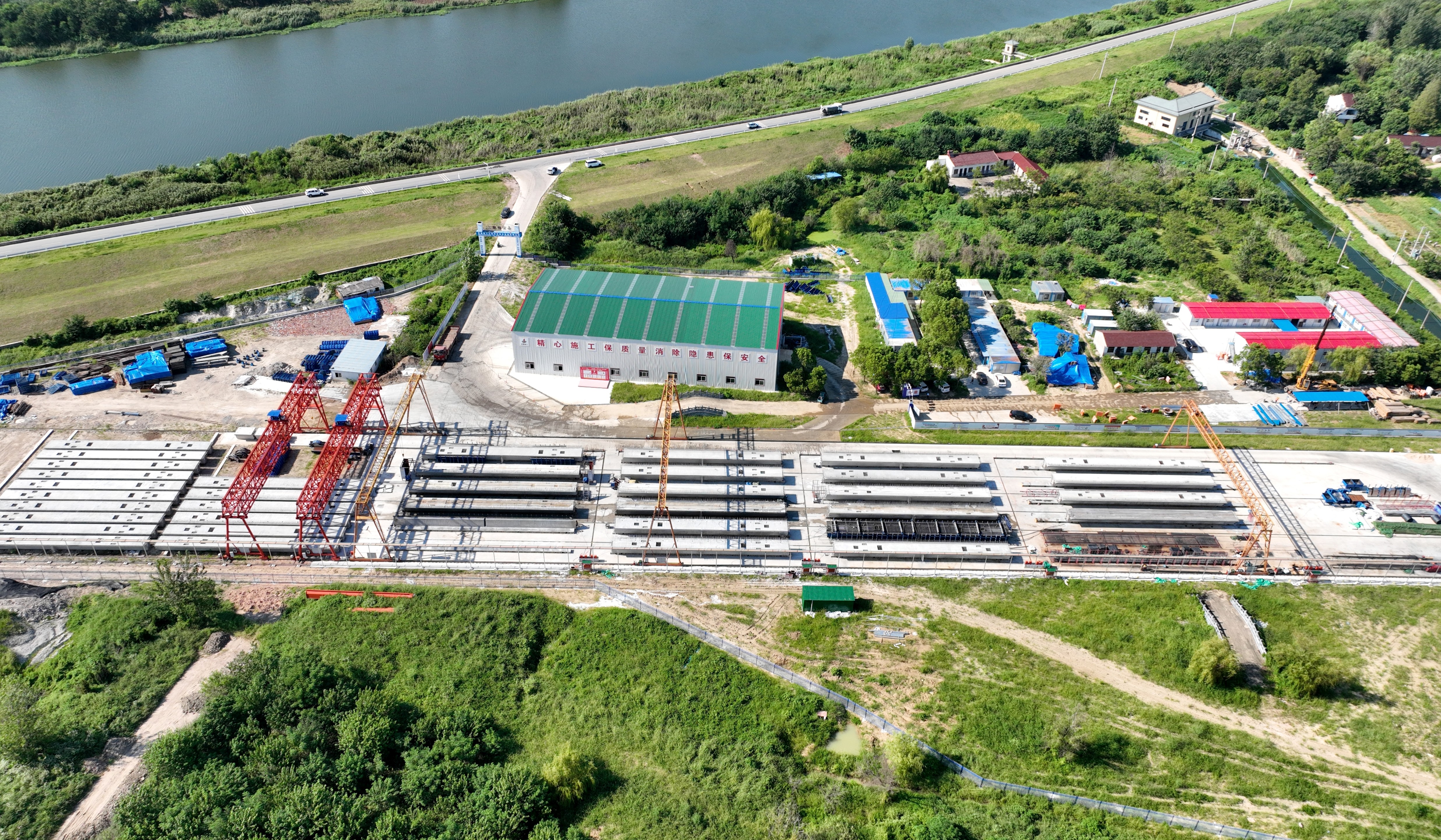 預(yù)制梁場(chǎng)作為橋梁架設(shè)的“后方糧倉(cāng)”,同樣按下“加速鍵”。項(xiàng)目規(guī)劃的2處標(biāo)準(zhǔn)化預(yù)制梁場(chǎng),承擔(dān)著全線2130片箱梁的預(yù)制任務(wù),其建設(shè)進(jìn)度與制梁效率直接關(guān)系橋梁架設(shè)的連續(xù)性。其中,1#梁場(chǎng)(占地40畝)擔(dān)負(fù)杭埠河特大橋南岸箱梁預(yù)制工作,目前該梁場(chǎng)生產(chǎn)線進(jìn)入批量生產(chǎn)階段,已完成42片箱梁澆筑;規(guī)模更大的2#梁場(chǎng)(占地70畝)擔(dān)負(fù)杭埠河特大橋北岸、跨三河支線特大橋及東一支渠大橋共1140片箱梁的預(yù)制工作,目前整體建設(shè)進(jìn)入收尾階段,預(yù)計(jì)近期可投入使用,屆時(shí)兩處梁場(chǎng)將形成“南北呼應(yīng)、同步制梁”的產(chǎn)能格局。