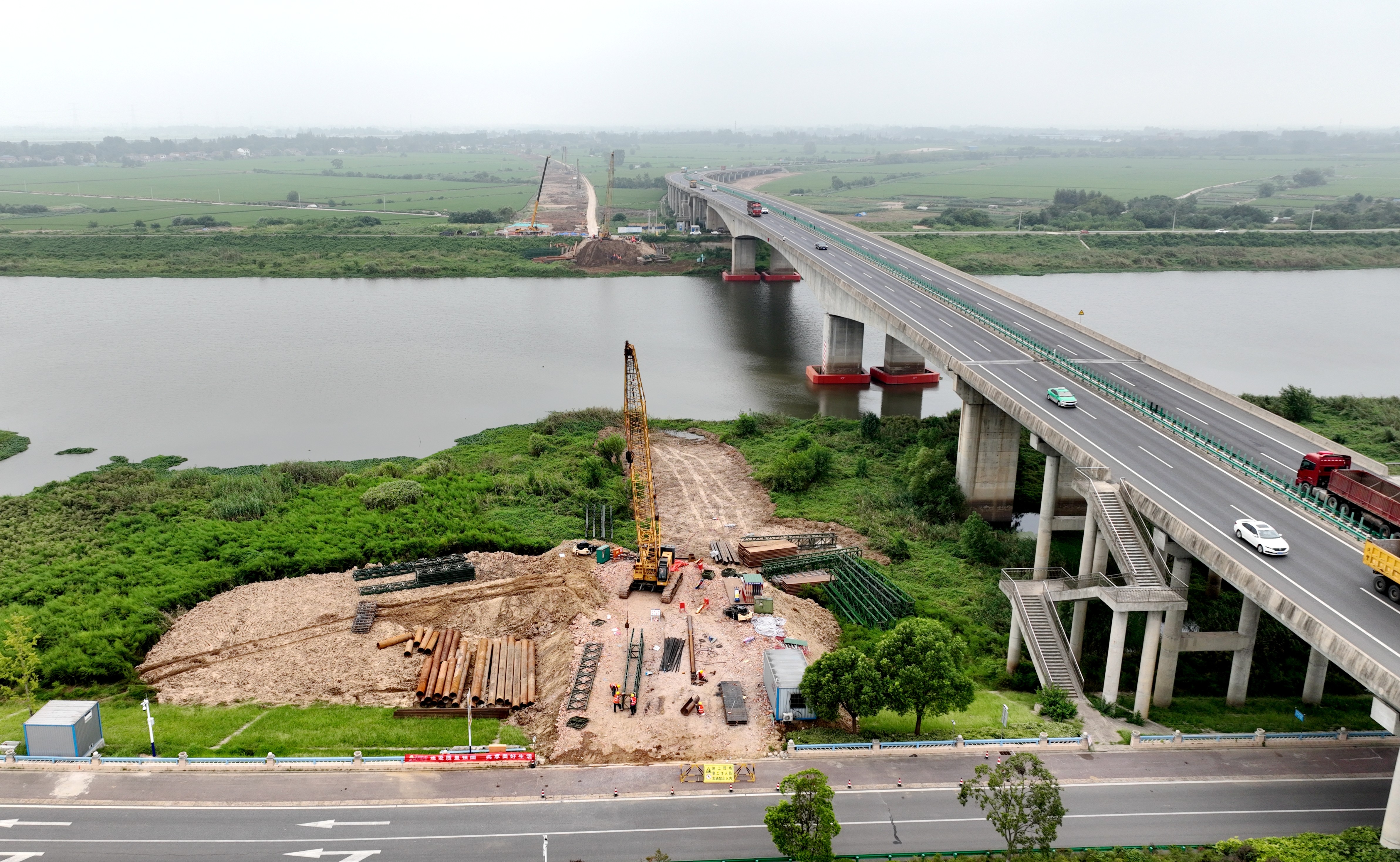 作為全線重難點及控制性工程,杭埠河特大橋全長約5.63公里,主橋采用85+150+85米矮塔斜拉橋結(jié)構(gòu),橫跨杭埠河核心河道,其施工進度直接關(guān)系項目整體工期。項目結(jié)合現(xiàn)場地質(zhì)條件與施工環(huán)境,多次組織行業(yè)專家召開技術(shù)研討會,創(chuàng)新采用“南北兩岸同步推進、流水作業(yè)銜接”模式提速攻堅,保障主墩、過渡墩施工的順利推進。反復(fù)優(yōu)化專項施工方案,全程嚴格把控工藝標(biāo)準(zhǔn)與安全管控細節(jié),確保東一支渠大橋首根樁基的順利澆筑。