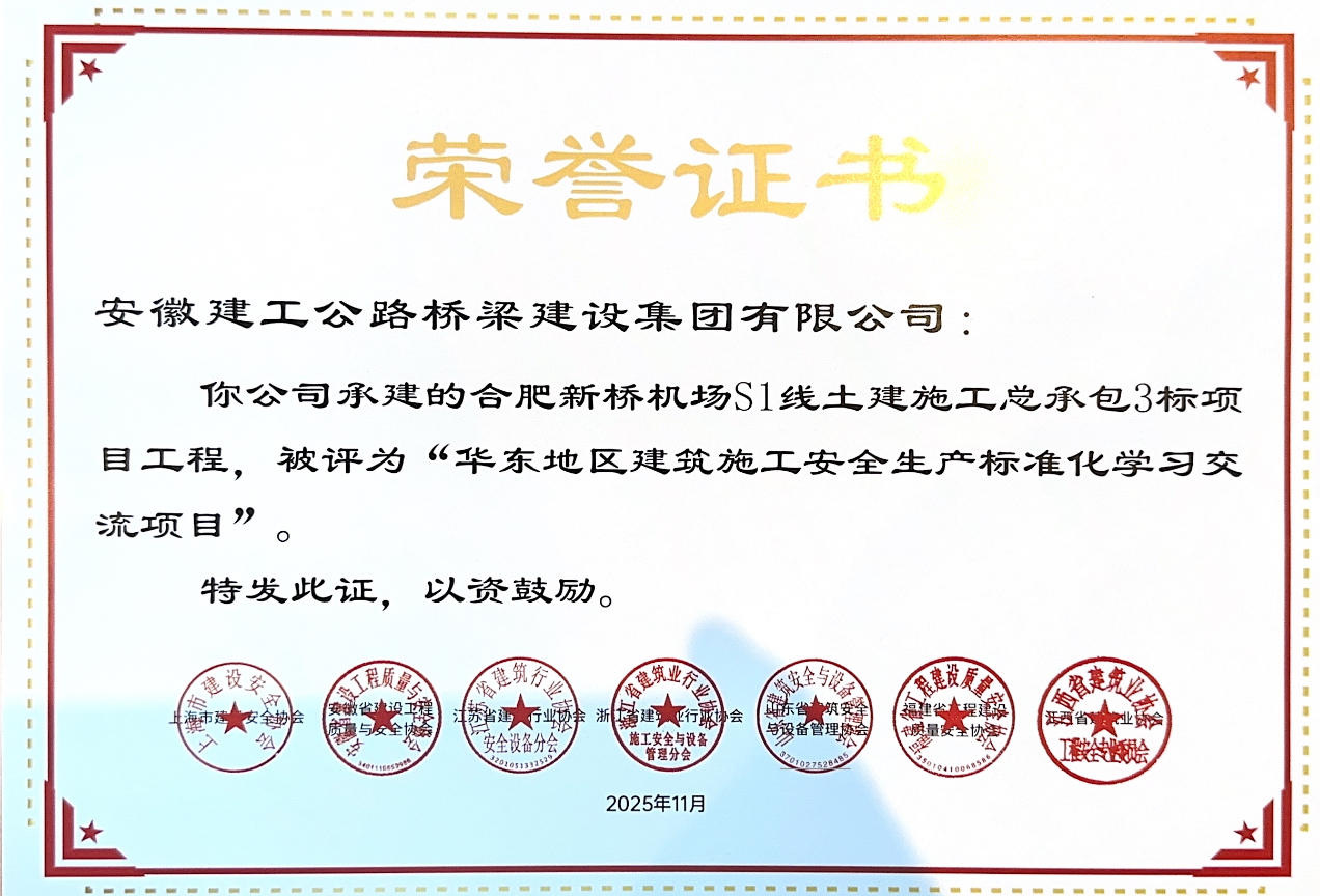 近日,華東地區(qū)建筑安全聯(lián)席會公布了“2025年度華東六省一市建筑施工安全生產(chǎn)標準化工地學習交流項目名單”,公司承建的合肥新橋機場S1線土建施工總承包3標、合肥新橋機場S1線合肥西站樞紐先行段工程土建施工總承包項目光榮上榜。邵嘉兵、宋廣輝獲評優(yōu)秀項目經(jīng)理稱號,李蘇蘇、段興一獲評優(yōu)秀項目安全總監(jiān)稱號。