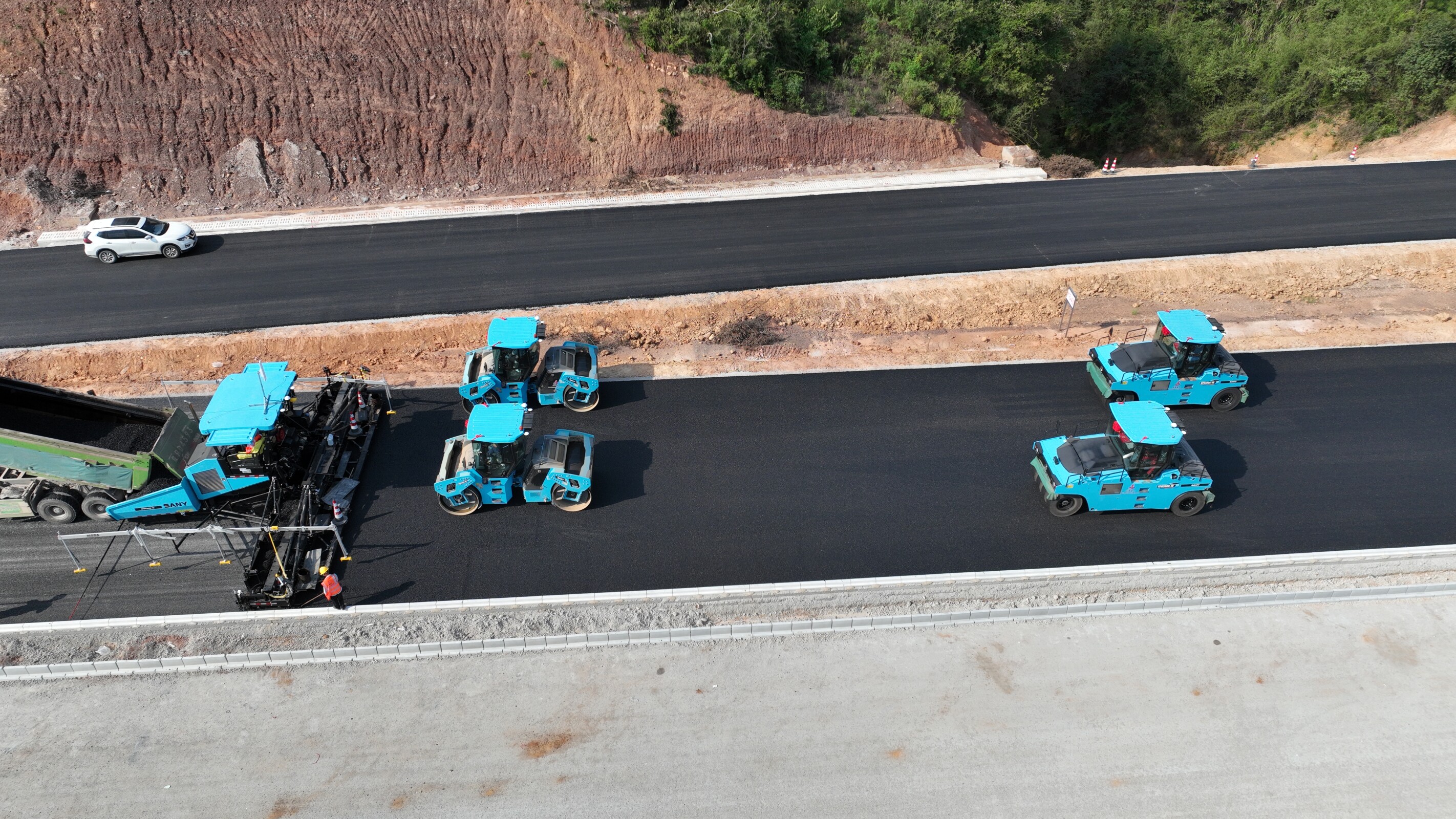 加快新設(shè)備運(yùn)用。在涇青高速04標(biāo),繼瀝青中下面層成功運(yùn)用“雙機(jī)聯(lián)鋪”技術(shù)后,項(xiàng)目在上面層施工中引入“無人攤鋪機(jī)群”,大幅提升了施工效率和質(zhì)量,獲得省公路學(xué)會(huì)的高度關(guān)注。在S334峨山路東延伸新建二期工程,項(xiàng)目采用激光攤鋪機(jī)進(jìn)行橋面鋪裝,有效提高了攤鋪效率與平整度,為后續(xù)面層規(guī)?;┕ご蛳聢?jiān)實(shí)基礎(chǔ)。