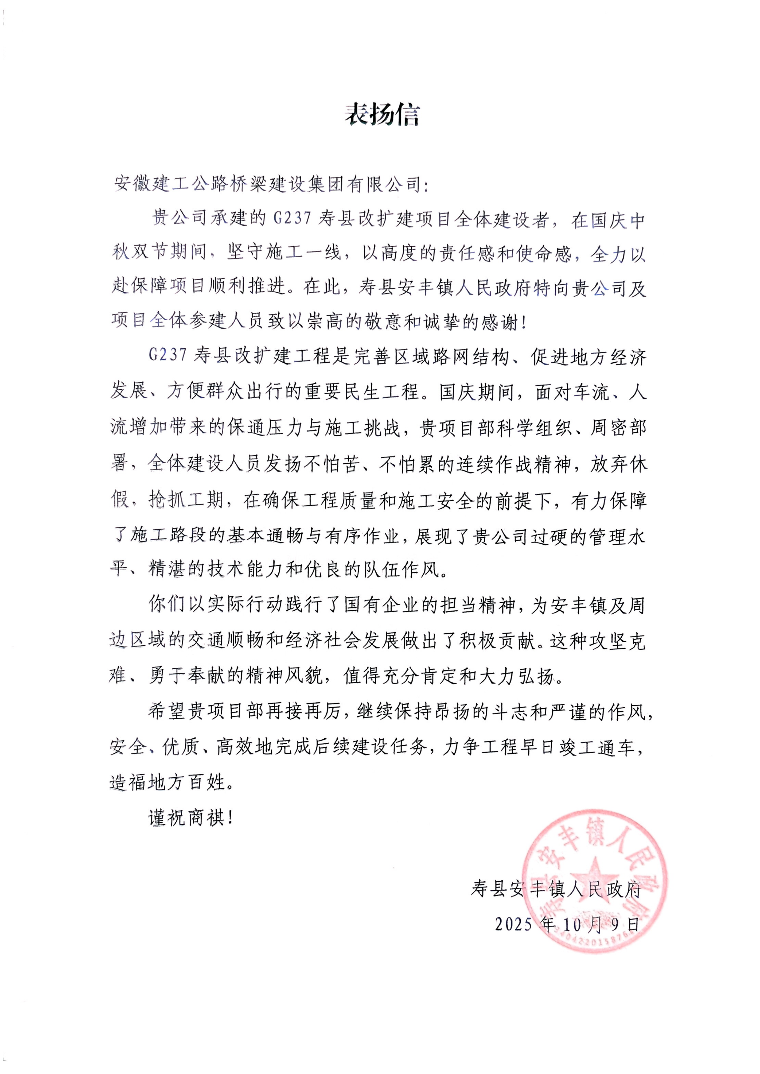 公司承建的G237壽縣改擴建項目全體建設(shè)者,在國慶中秋雙節(jié)期間,堅守施工一線,以高度的責任感和使命感,全力以赴保障項目順利推進。為安豐鎮(zhèn)及周邊區(qū)域的交通順暢和經(jīng)濟社會發(fā)展做出了積極貢獻。——壽縣安豐鎮(zhèn)人民政府
