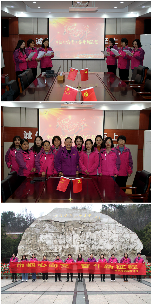 路面公司組織全體女職工開展以“巾幗心向黨 奮斗新征程”為主題的系列活動?!白x經(jīng)典、歌頌黨”朗誦活動,贊美了中國共產黨百年來走過的光輝歷程,表達對祖國深沉的熱愛之情。隨后,開展了“緬懷先烈、激揚斗志”的緬懷先烈活動,集體參觀了大蜀山烈士陵園,深切緬懷革命先烈的豐功偉績。