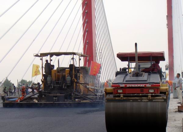 為了提高大橋橋面瀝青鋪裝質(zhì)量,在攤鋪前項(xiàng)目部組織200余名工人突擊清理橋面表面浮漿,待沖刷干凈并涂上防水層后,開始攤鋪瀝青。在攤鋪過程中全部使用自動(dòng)攤鋪機(jī)和重型壓路機(jī),使攤鋪、碾壓等工序科學(xué)合理、規(guī)范達(dá)標(biāo)。攤鋪施工剛一結(jié)束,黑亮寬敞而又整潔順暢的橋面就引來周邊過往市民的嘖嘖稱贊。