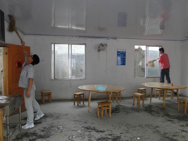下午5點,按照先前的分工,各部門的團員都積極行動起來。試驗室負責餐廳生活區(qū),工程部、質(zhì)檢部負責宿舍樓,其余部門負責辦公走廊及前場活動區(qū)域的衛(wèi)生打掃。清洗桌子,擦洗門窗、打掃走廊,清理枯枝敗葉,經(jīng)過兩小時的辛勤勞動,整個項目部煥然一新。
