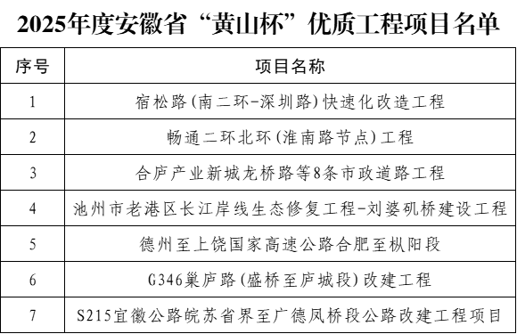 近日,安徽省住房和城鄉(xiāng)建設廳公布了2025年度安徽省“黃山杯”優(yōu)質(zhì)工程項目名單,公司7個項目榮耀登榜,創(chuàng)下公司年度獲獎數(shù)量歷史新高,獎項涵蓋公路、市政等多個領域,充分彰顯了公司在工程建設領域的雄厚技術實力與精益求精的匠心品質(zhì)。