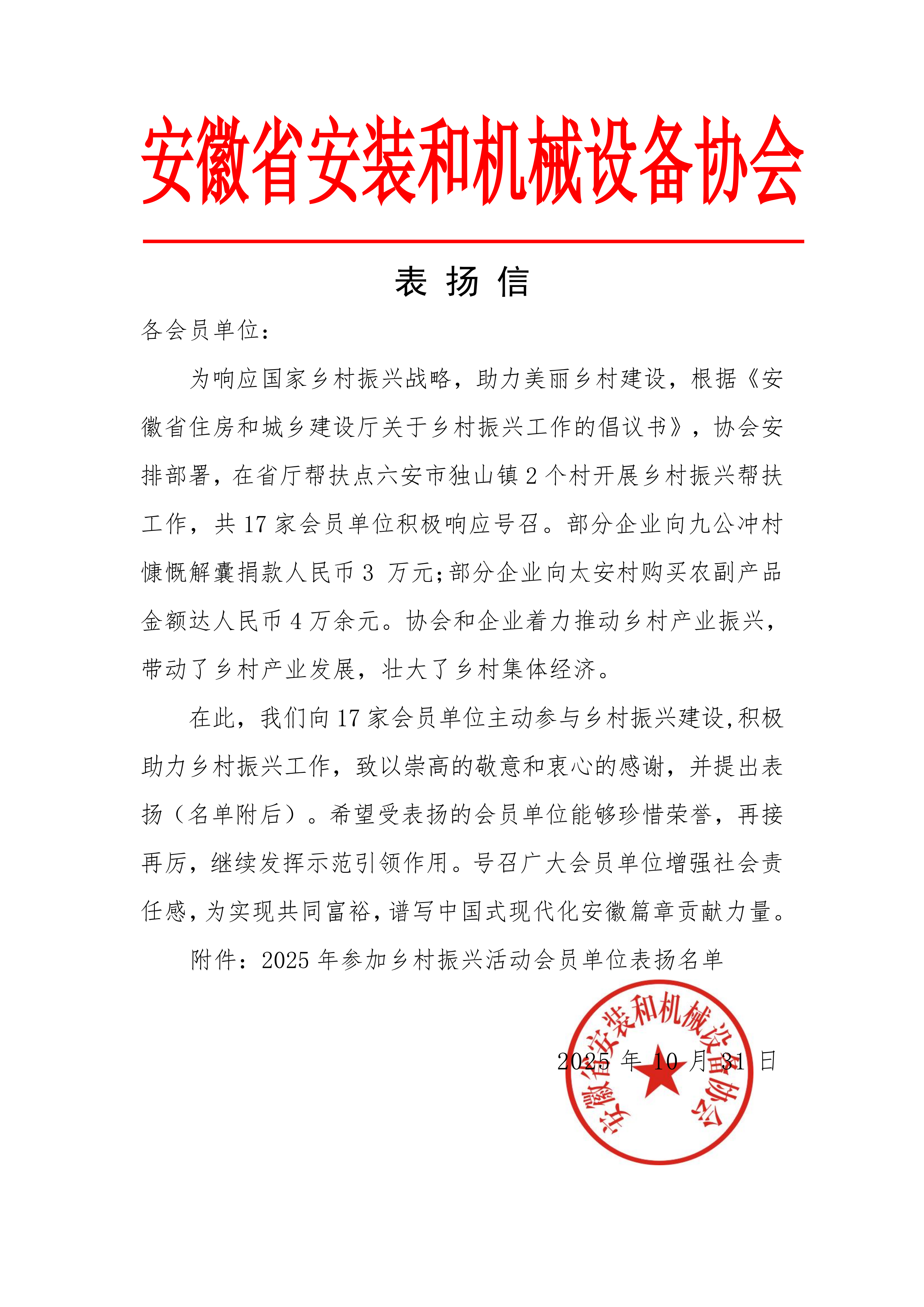 公司積極響應(yīng)國家鄉(xiāng)村振興戰(zhàn)略,助力美麗鄉(xiāng)村建設(shè),根據(jù)《安徽省住房和城鄉(xiāng)建設(shè)廳關(guān)于鄉(xiāng)村振興工作的倡議書》,協(xié)會安排部署,著力推動鄉(xiāng)村產(chǎn)業(yè)振興,帶動了鄉(xiāng)村產(chǎn)業(yè)發(fā)展,壯大了鄉(xiāng)村集體經(jīng)濟。——安徽省安裝和機械設(shè)備協(xié)會