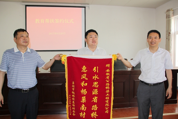 6月20日下午,在巢湖市槐林鎮(zhèn)惠峰村活動中心,槐林鎮(zhèn)黨委主要負責人將一面錦旗贈予安徽省公路橋梁工程有限公司,以感謝公司為當?shù)胤鲐毠ぷ髯鞒龅呐拓暙I。公司黨委委員、副總經(jīng)理任杰代表公司接受了錦旗。