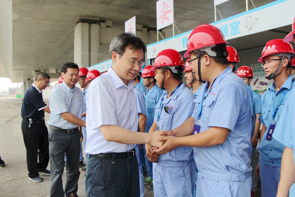 連日以來(lái),高溫酷暑籠罩著江淮大地,但廣大安徽路橋人依然堅(jiān)守施工一線,揮汗如雨。7月26日上午11時(shí),安徽省住建廳黨組書(shū)記、廳長(zhǎng)張?zhí)炫?,黨組成員、副廳長(zhǎng)吳桂和,副巡視員劉少為一行在集團(tuán)工會(huì)主席徐曉光,公司董事長(zhǎng)、黨委書(shū)記、總經(jīng)理孫學(xué)軍等有關(guān)人員的陪同下,深入合肥阜陽(yáng)北路高架項(xiàng)目看望慰問(wèn)一線建設(shè)者,叮囑項(xiàng)目部做好防暑降溫工作,切實(shí)保障職工身心健康。